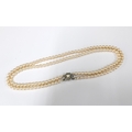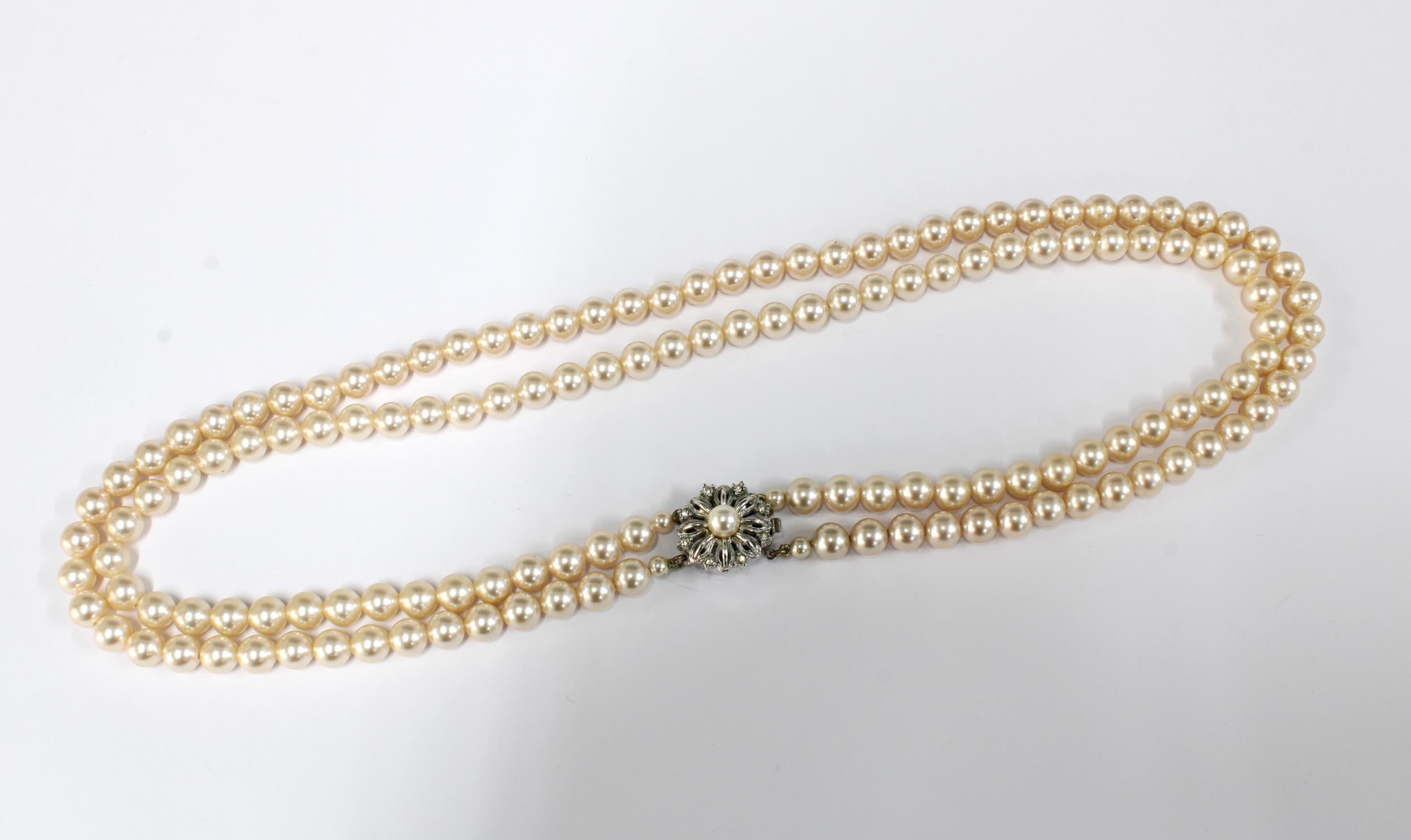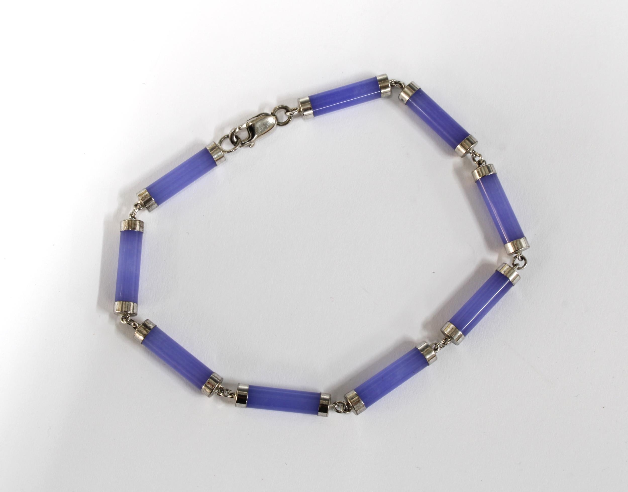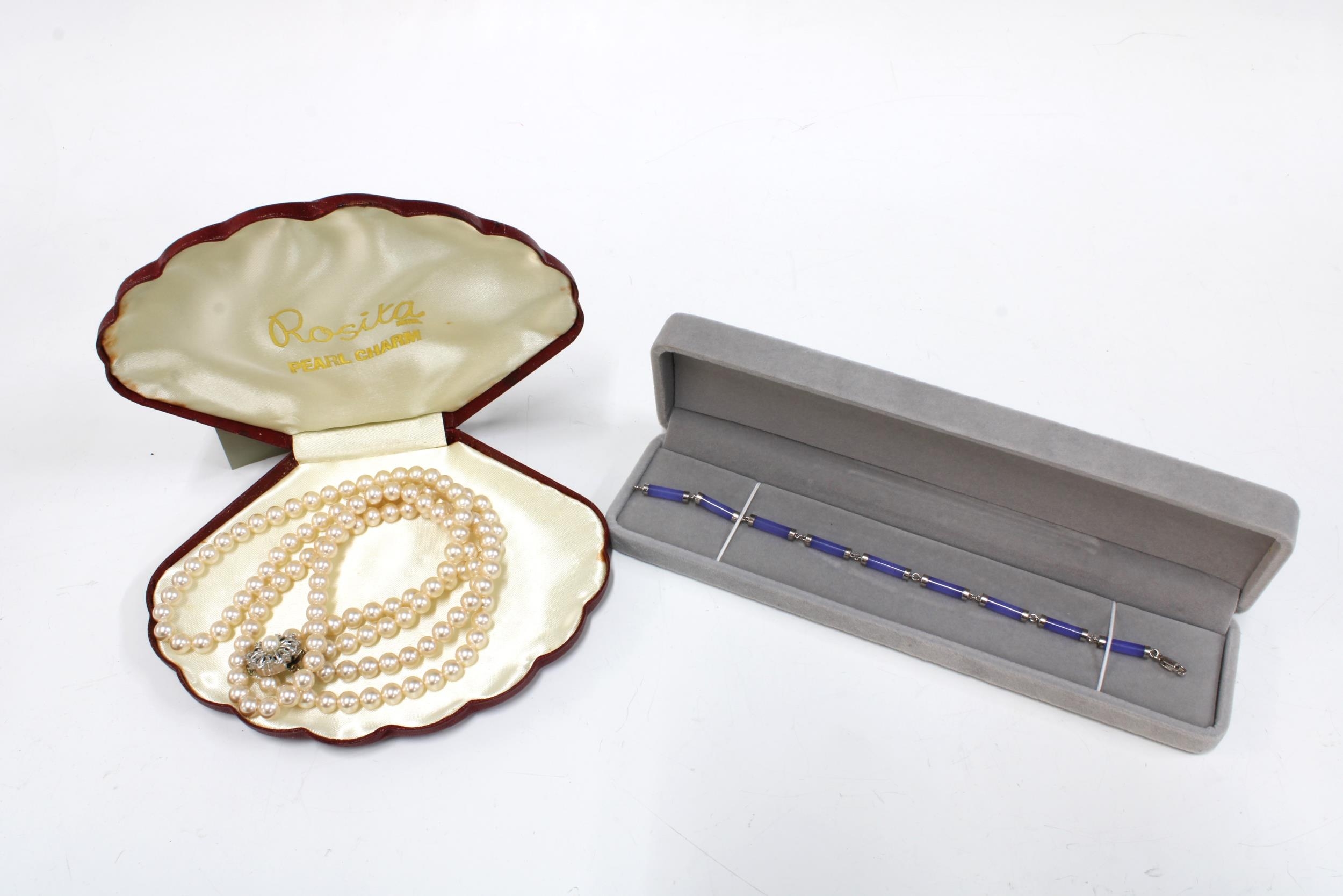 A silver and lilac jadeite bracelet and a double strand faux pearl necklace (2)