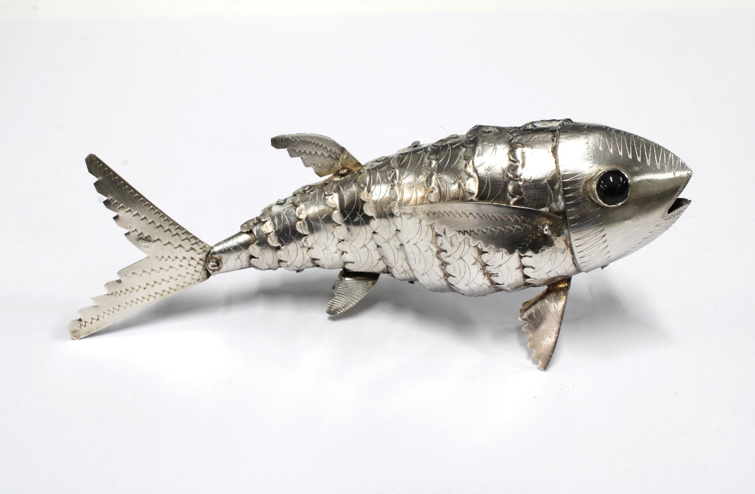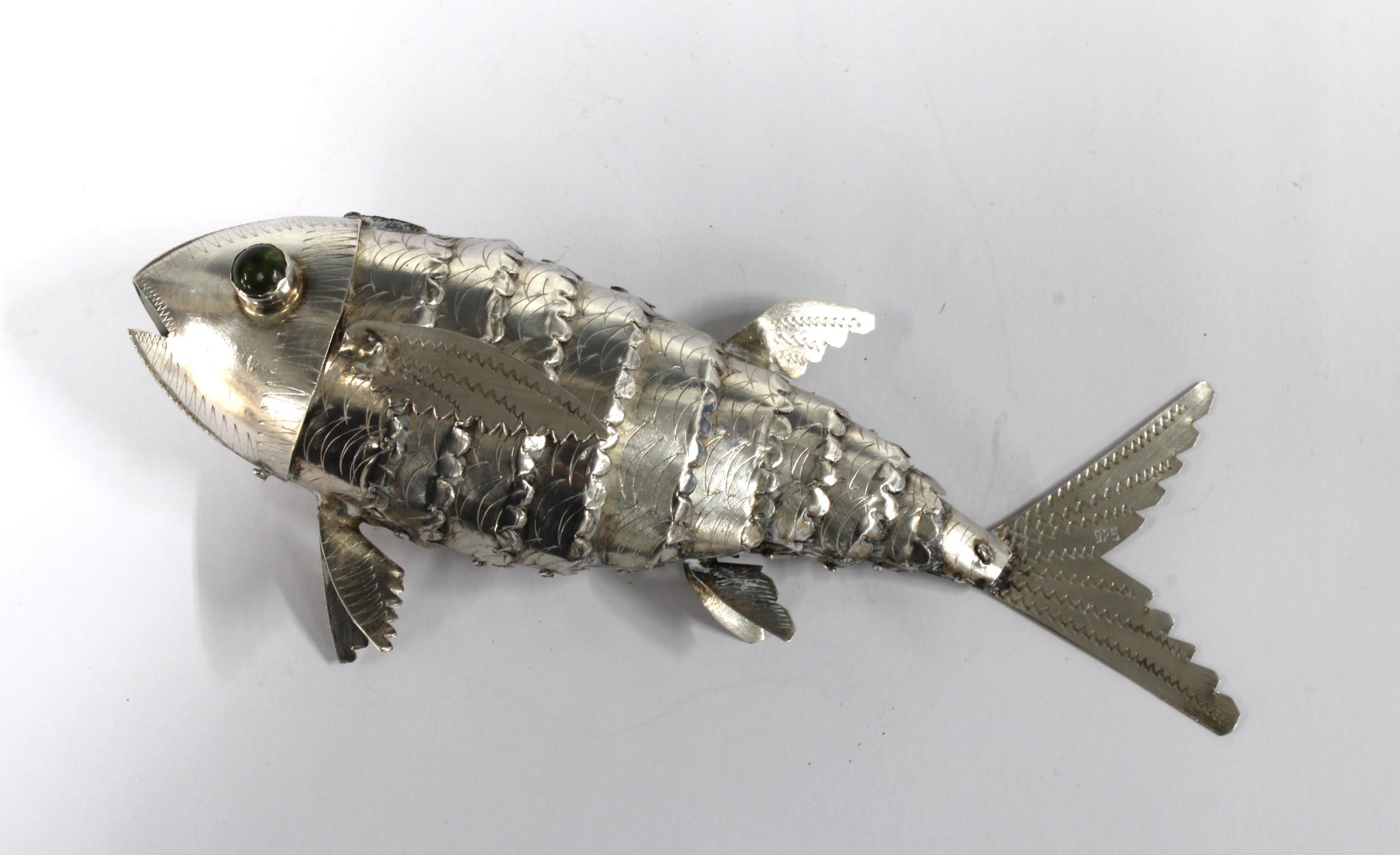 White metal articulated fish with bead eyes, 14cm long