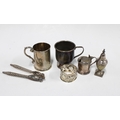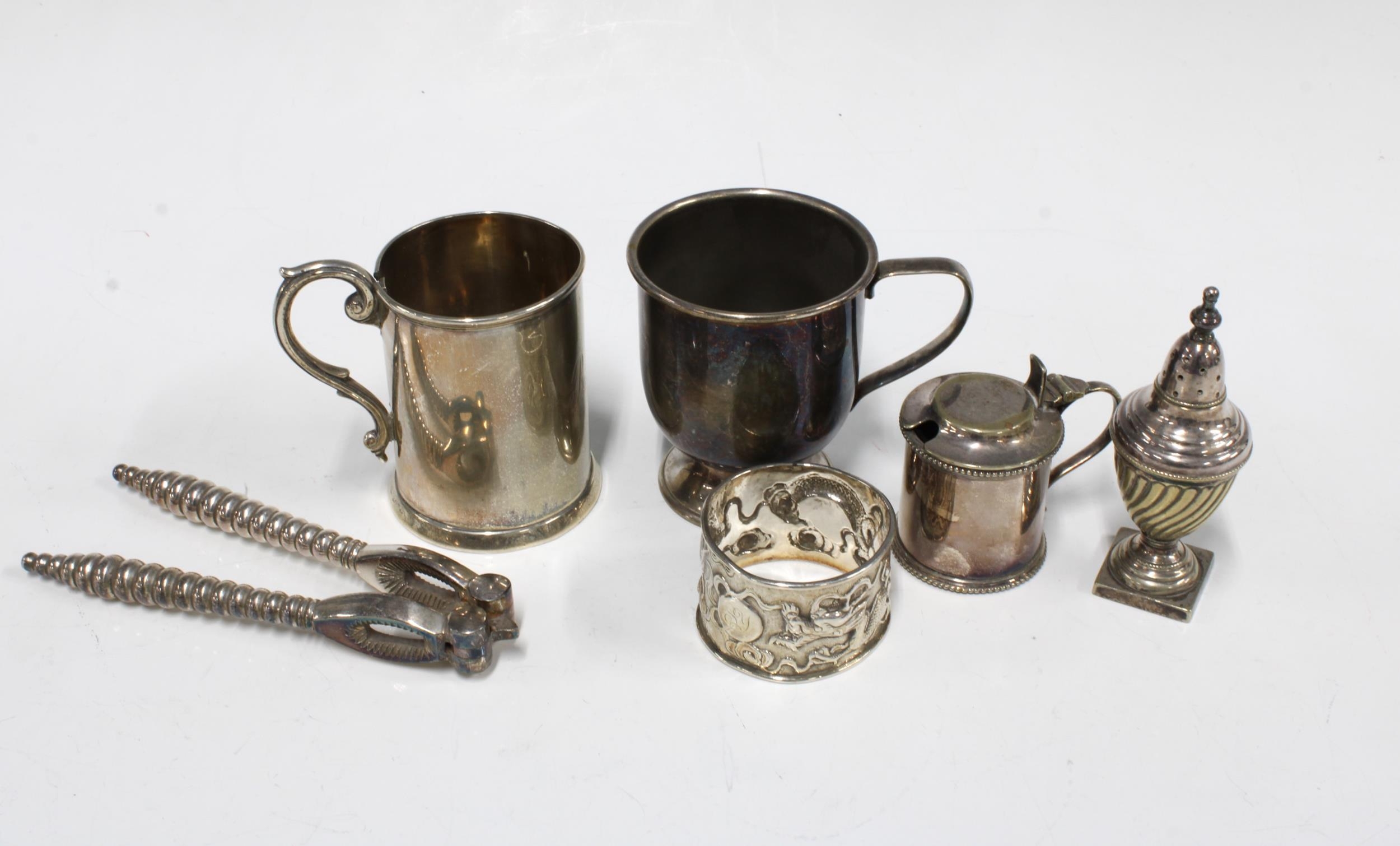 Wakely & Wheeler silver dragon napkin ring, import marks for London 1912 together with a silver plated pepper pot, mustard pot, nut cracks and Christening beaker and another (6)